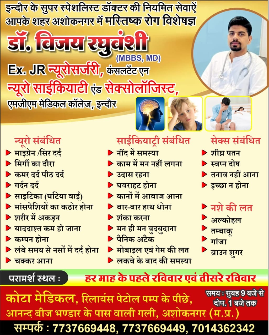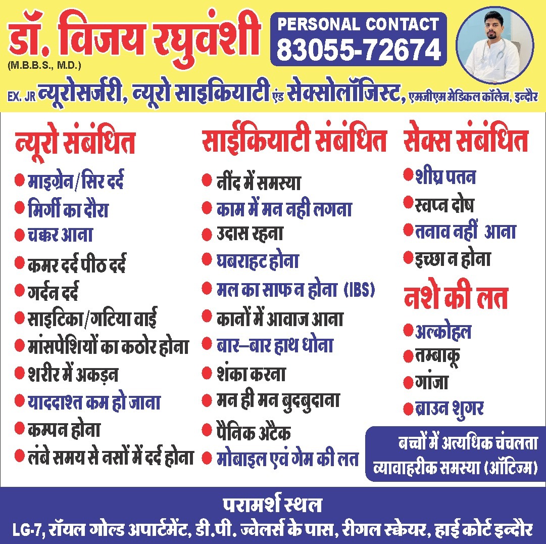 At the clinic of Dr. Vijay Raghuwanshi (MBBS, MD), we are committed to providing expert care in Neuropsychiatry, Sexology, and De-addiction treatment. With a strong background in Neurosurgery (Ex. JR, MGM Medical College, Indore) and years of clinical experience, Dr. Vijay has been helping patients overcome complex neurological, psychiatric, and sexual health challenges.